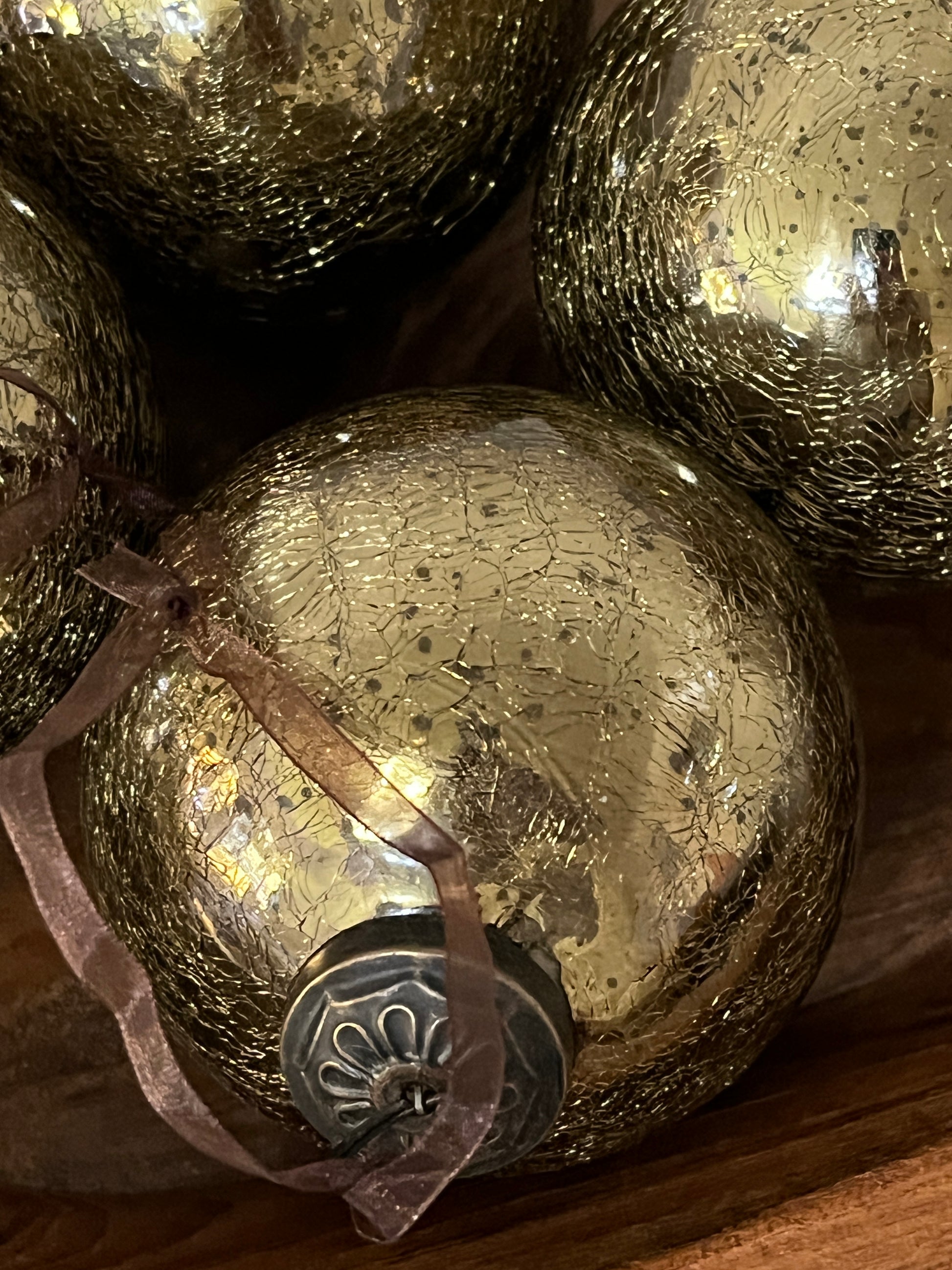 Measuring around 10cm, this hand blown Large Olive Green Crackle Glass Bauble showcases a beautifully detailed bronze cap and is finished with a matching organza ribbon for an elegant touch.