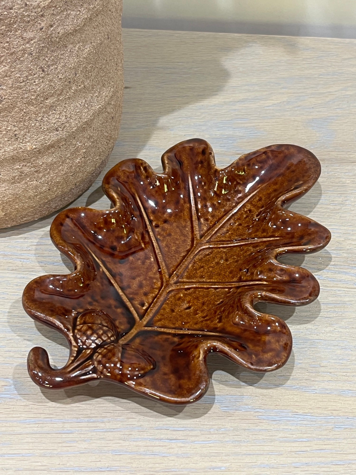 Add a touch of nature-inspired charm to any space with this glazed brown leaf trinket dish. Its distinctive design makes it a captivating decorative piece for your living room, bedroom, or study. Perfect for keeping your jewellery organised and easily accessible, or simply as an elegant accent, this dish brings warmth and style wherever it’s placed. Elevate your décor effortlessly with this unique and functional accessory.
