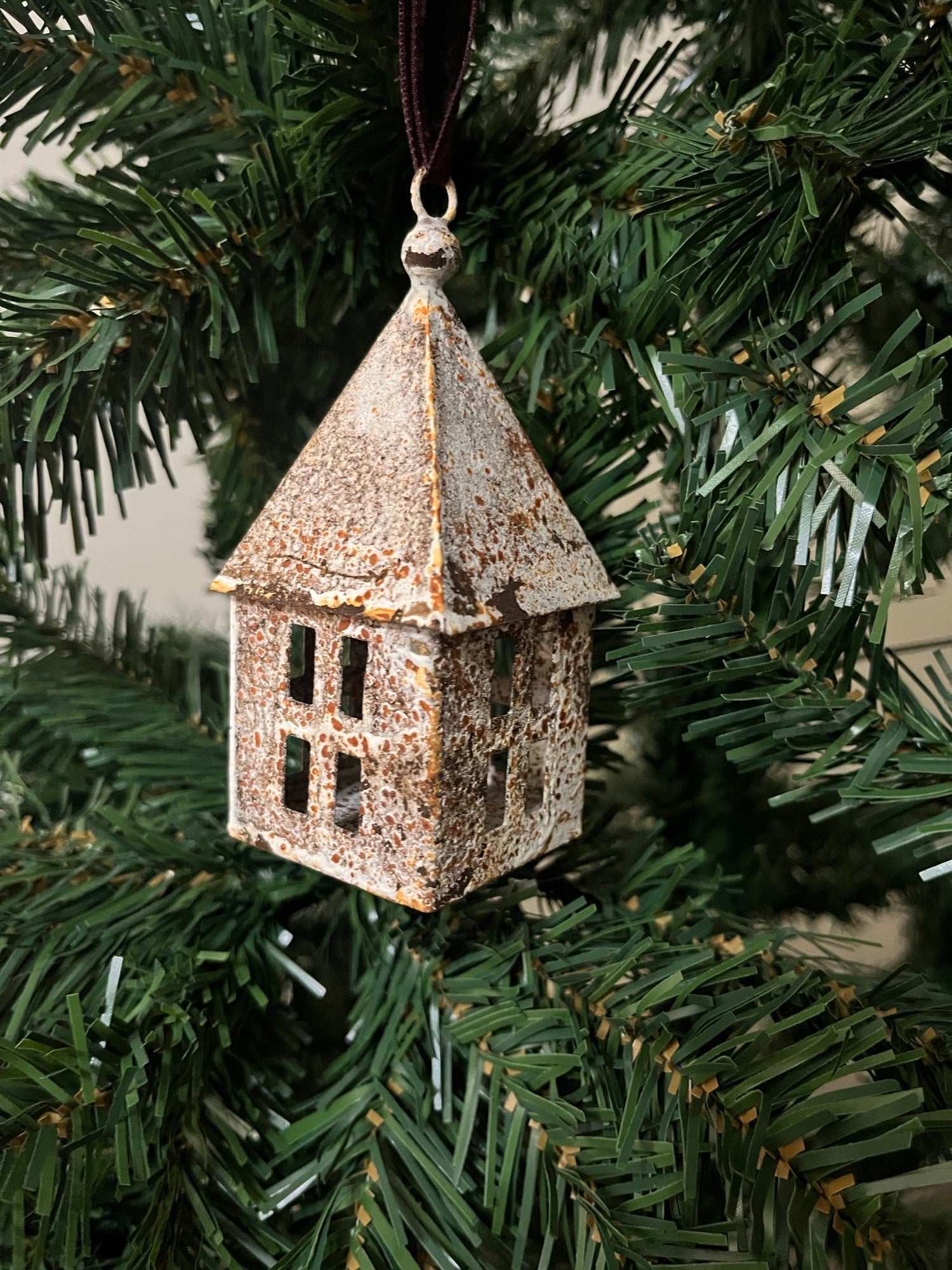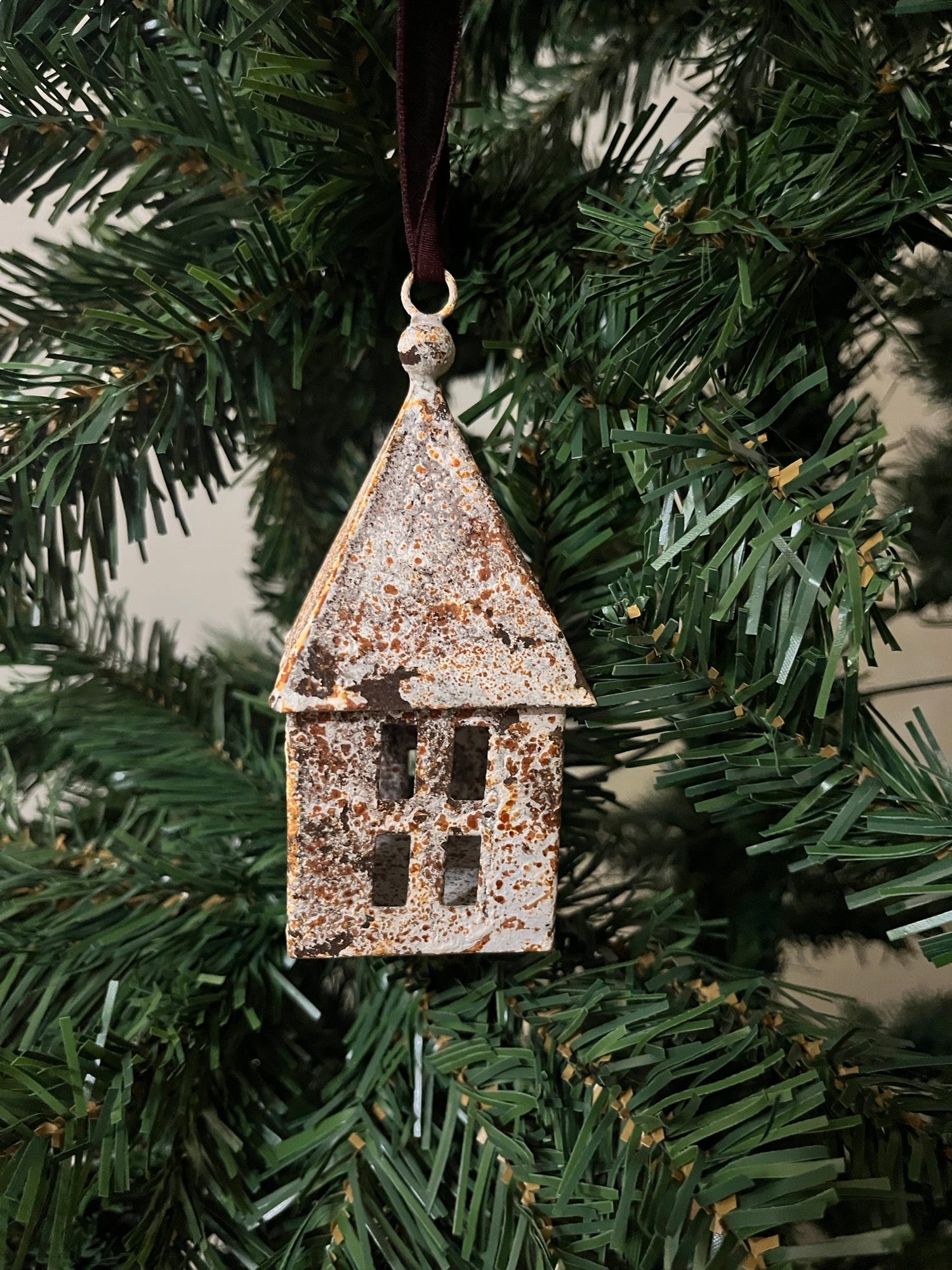 Bring cosy charm to your décor with the Rustic Iron House Bauble. Featuring a delicate house-shaped design complete with windows and a door, it showcases a rustic finish of white paint and natural rust accents. Intricate cut-out details enhance its vintage appeal, all suspended from a rich deep brown velvet cord — perfect for adding warmth and character to your home or festive display.