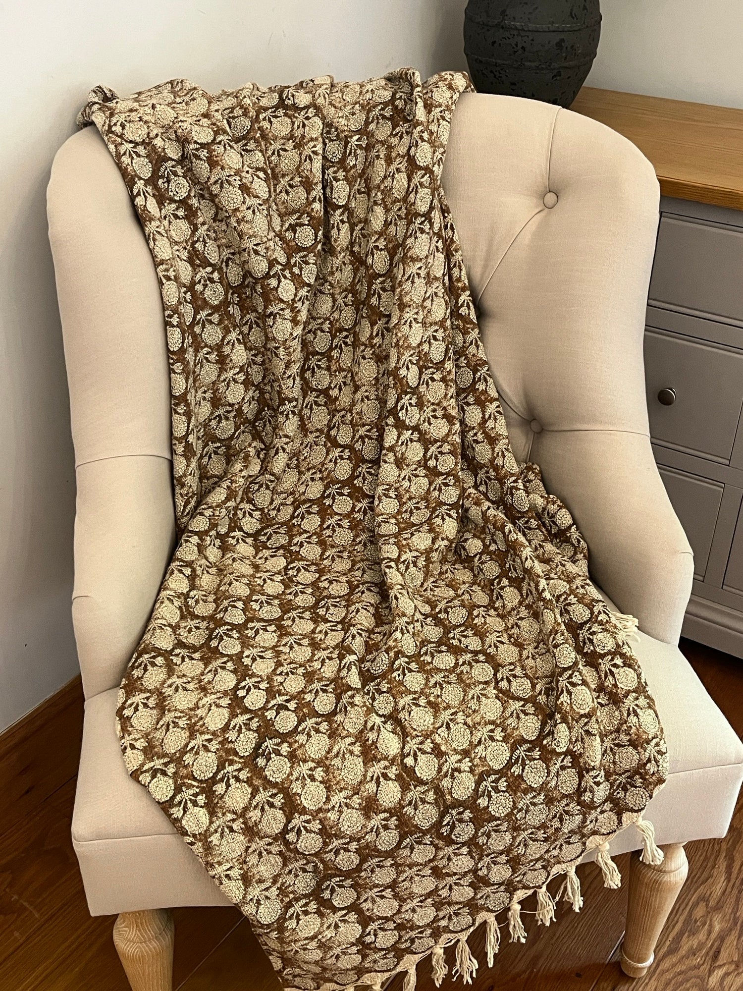 Add a touch of natural elegance to your home with the AURORA Hand Block Printed Throw in brown and cream. Crafted using traditional hand block printing, this throw blends earthy tones with intricate patterns to create a cosy yet sophisticated accent. Ideal for layering on sofas or beds, it brings warmth and a subtle artistic flair to any room, making your space feel inviting and uniquely styled. Embrace timeless craftsmanship with this beautiful, versatile throw.