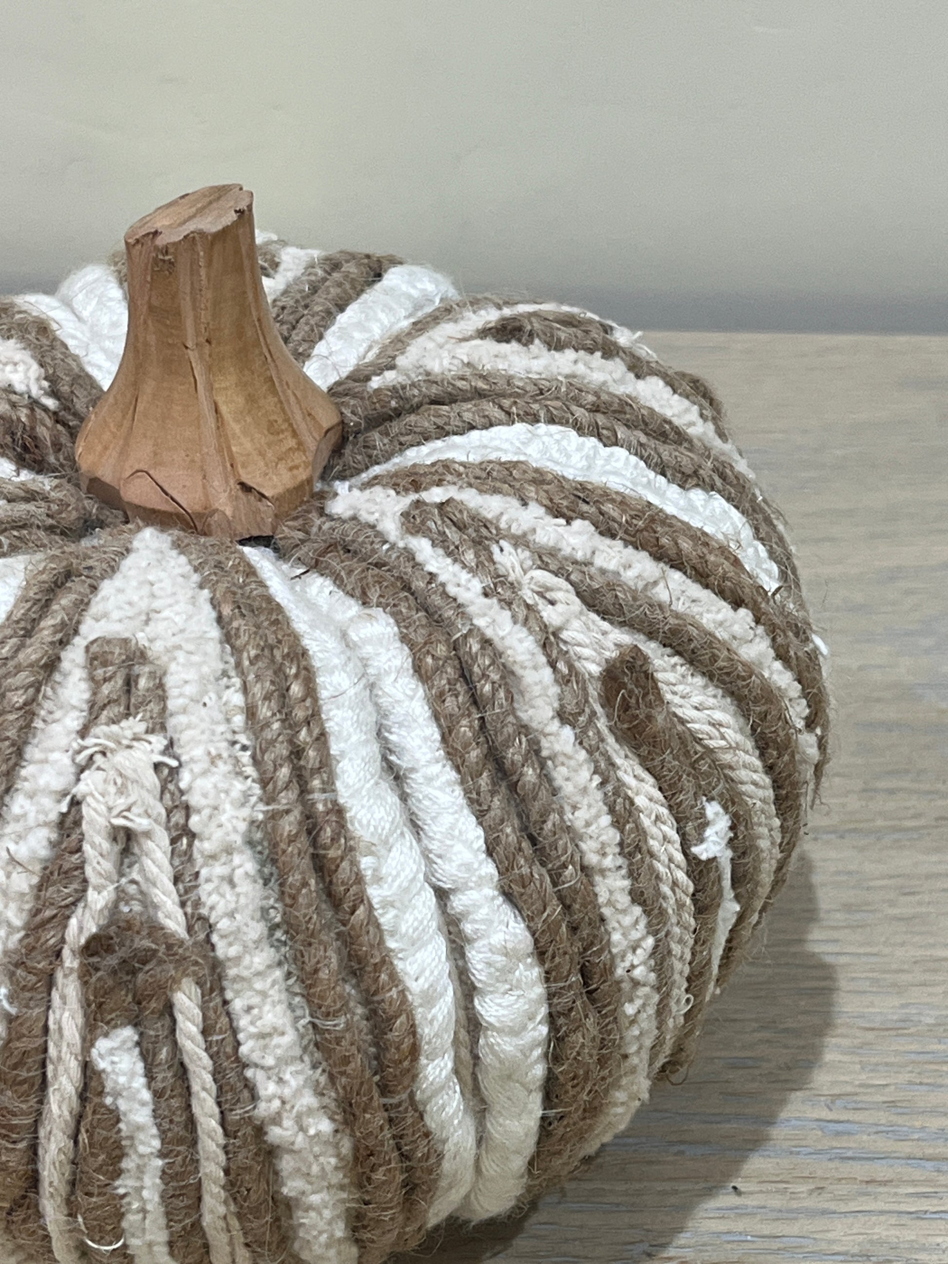 Enhance your living space with the Yarn Pumpkin in soft neutral tones. Its subtle beige and cream stripes bring a cosy, elegant touch to any table or shelf. Crafted with care, this fabric pumpkin adds warmth and texture, making it an inviting seasonal accent that blends seamlessly with your décor. Perfect for creating a welcoming atmosphere all autumn long.